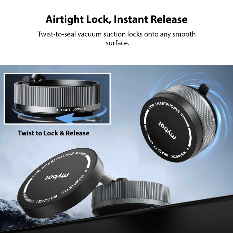 Snap. Seal. Stay. Meet AirTight, the ultimate vacuum-sealing MagSafe phone mount designed for zero-slip stability. Using a powerful neodymium magnetic hold and an innovative twist-to-seal vacuum base, this mount locks down your device with double the grip—ensuring it stays securely in place whether you're driving, working, or streaming. Compatible with all smartphones, including MagSafe iPhones and metal ring accessories, AirTight offers 360° rotation and a fully adjustable arm for the perfect view in any setting. No buttons, no tools—just twist, seal, and go.