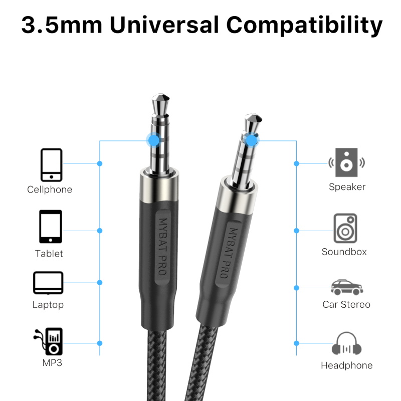 Connect the sound, not the hassle. The MyBat Pro 3.5mm Male to 3.5mm Male Audio Cable features dual 3-pin TRS connectors for smooth stereo output between any two AUX-enabled devices. Its right-angle design reduces strain at the port and helps maintain a low profile in tight setups like cars or desks. At 4 feet long, it's perfect for everyday listening from your phone, tablet, or laptop to any speaker or stereo input.