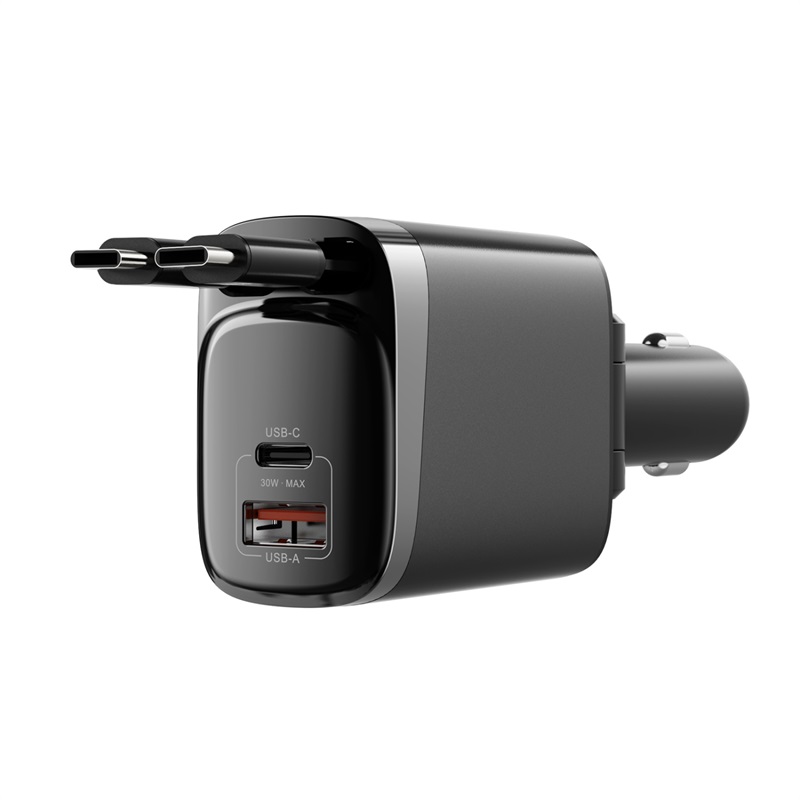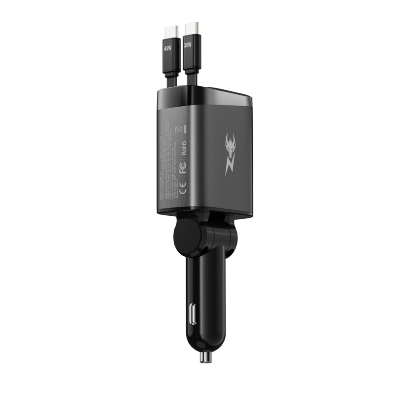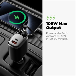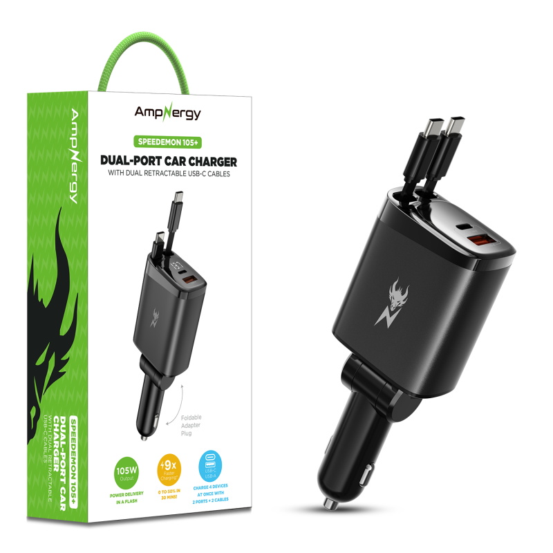 More power. More speed. Less clutter. The AmpNergy Speedemon 105+ Dual-Port Car Charger with Dual Retractable USB-C Cables offers fast, efficient charging for drivers with multiple devices on the move. Equipped with two retractable USB-C cables (45W + 30W), a USB-C port, and a USB-A port, it delivers flexible, high-output charging for phones, tablets, laptops, and more—all from a compact, road-ready design. Each retractable USB-C cable extends smoothly when needed and retracts cleanly into the body for a tangle-free, space-saving setup. With Power Delivery (PD) and Quick Charge (QC) support, every port is engineered to deliver optimal speed while maintaining safe, reliable performance. The durable aluminum-alloy housing elevates heat dissipation and adds a premium feel that stands up to daily use. Designed for commuters, families, and frequent travelers, this charger keeps every device powered up and every ride running smoothly.