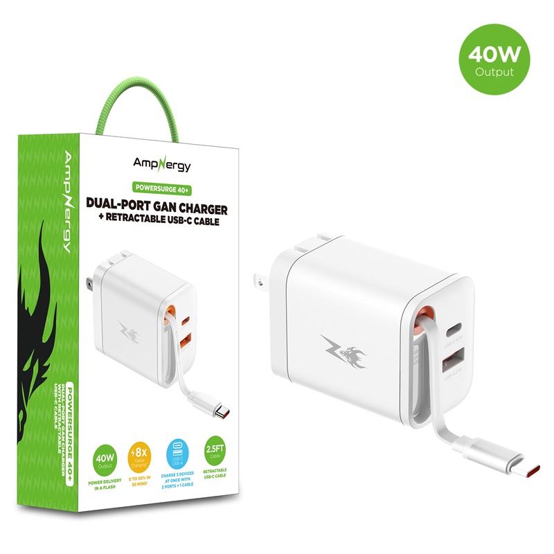 Power that pulls its weight—literally. The AmpNergy PowerSurge 40+ is built for those who demand speed, efficiency, and versatility. Powered by next-gen Gallium Nitride (GaN) technology, this charger packs 40W of high-speed USB-C Power Delivery (PD), a 27W USB-A Quick Charge (QC) port, and a built-in 2.5FT retractable USB-C cable—charging up to three devices at once without missing a beat. Whether powering up smartphones, tablets, or gaming consoles, Smart Chip Technology ensures faster, safer, and more efficient charging every time. Designed for the unstoppable, its compact, foldable design keeps your setup streamlined, while advanced protection guards against overheating, overcharging, and surges. Charge smarter. Power harder.
