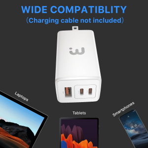 Powered by a supercharged gallium nitride semiconductor, this 67W GaN USB-C Charger generates 100 times the power of standard silicon chargers. Supporting the latest fast-charging technologies, Power Delivery, and Quick Charge in 2 powerful ports, your customers can fast-charge all their devices simultaneously. With an incredible 67W total max output, this charger can power a 16” Macbook Pro from 0 to 100% in 2 hours and the latest iPhone or Android smartphone in just an hour! As a smaller 67W charger, this ultra-compact and lightweight charger barely takes up any premium space in outlets and can conveniently fit in any bag for rapid charging wherever your customers go! Low heat operation ensures the charger remains cool to touch while providing the highest output!