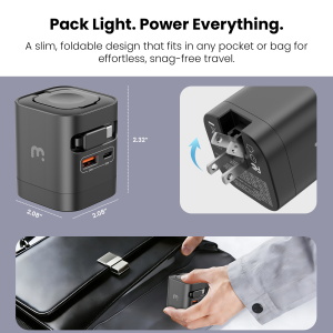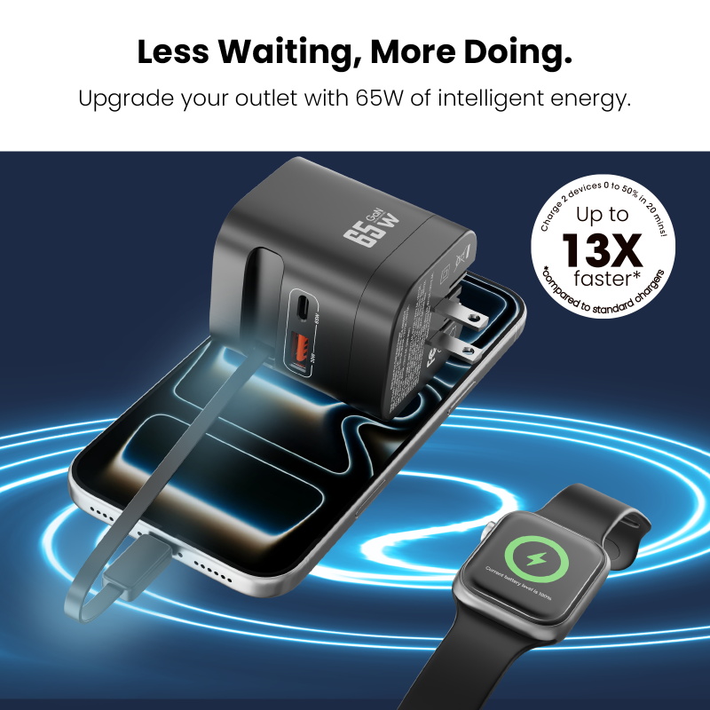 Stay powered, stay on time, stay connected. The MyBat Pro 65W Dual-Port GaN Wall Charger + Built-In Smartwatch Charging & Retractable USB-C Cable delivers the fast, reliable power your day demands, pushing phones from 0 to 50 percent in about 30 minutes while keeping tablets, earbuds, handhelds, and smartwatches ready when you need them. A retractable USB-C cable gives you instant, tangle-free charging, and the dual-port layout supports both USB-C and USB-A devices at the same time. A built-in smartwatch charging pad keeps your daily essentials powered without extra adapters or cables. GaN technology makes everything more efficient, keeping the charger compact, cool, and travel friendly so you can replace multiple bricks with one clean, all-in-one design. Whether you are heading out, packing light, or powering through a busy day, this charger keeps every device organized, charged, and right on schedule.