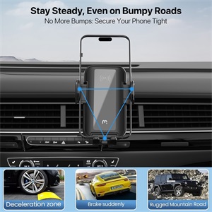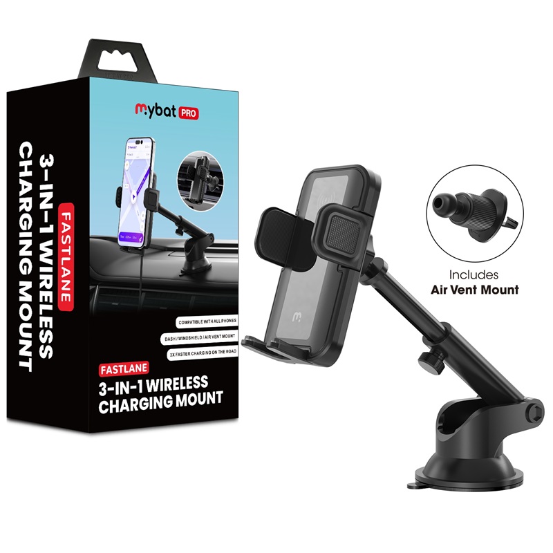 Stay in the Fast Lane: Mount, charge, and drive on. Get a boost every drive with the MyBat Pro FastLane 3-in-1 Wireless Charging Mount, designed for seamless hands-free convenience and enhanced road safety. Whether commuting, road-tripping, or navigating unfamiliar streets, this mount keeps devices securely in place while delivering fast wireless charging up to 15W. The versatile 3-in-1 mounting system adapts to dashboards, windshields, or air vents for a custom setup. A telescopic and 360° rotating design ensures optimal