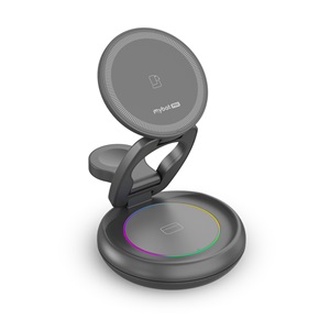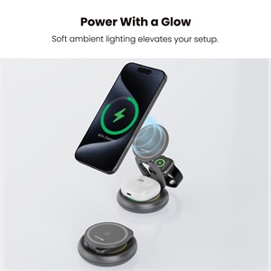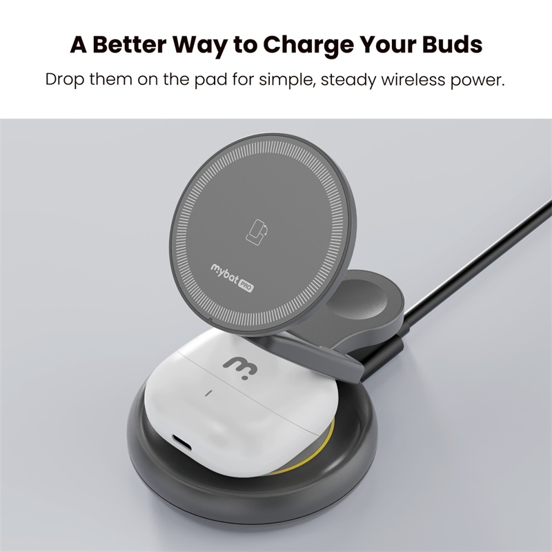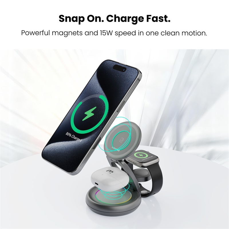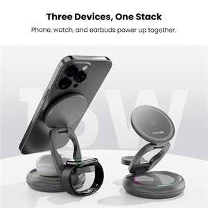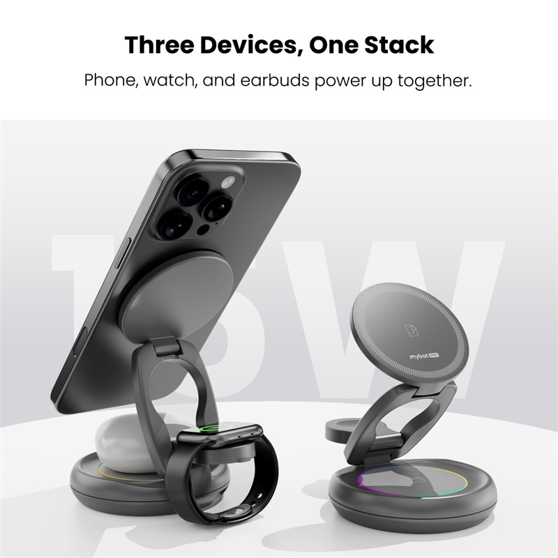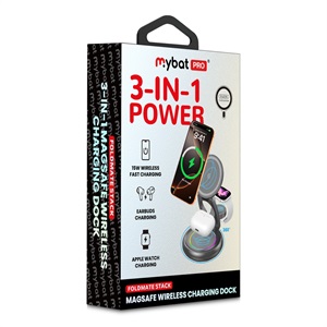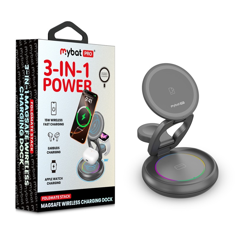 All your power, stacked. The MyBat Pro 3-in-1 FoldMate Stack Wireless Charging Dock brings fast, organized charging to your desk, nightstand, or wherever you power up. Designed as a compact, all-in-one dock, it neatly charges your phone, smartwatch, and wireless earbuds together in one sleek vertical setup. The MagSafe-compatible pad offers a perfect snap-on connection for your iPhone, while the built-in Apple Watch charging puck and Qi-enabled earbud pad deliver effortless power without cable clutter. When you are done, the dock folds completely flat for travel or easy storage. With up to 15W of fast wireless output, a soft-glow LED indicator, and intelligent safety control, the FoldMate Stack keeps every device powered, protected, and perfectly docked.