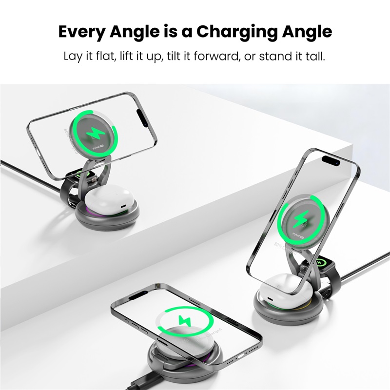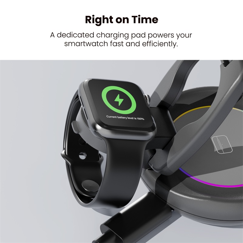 • 3-in-1 Wireless Charging Dock – Powers your smartphone, smartwatch, and wireless earbuds together in one organized station.