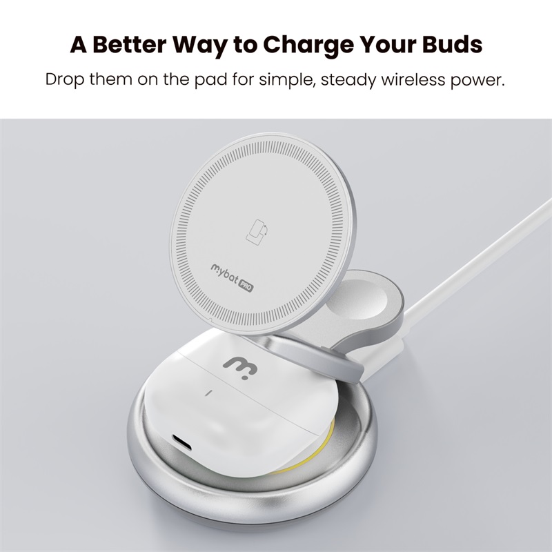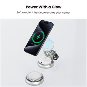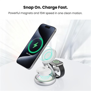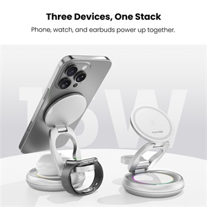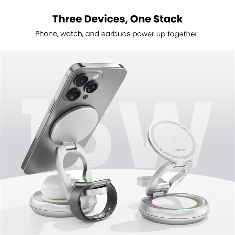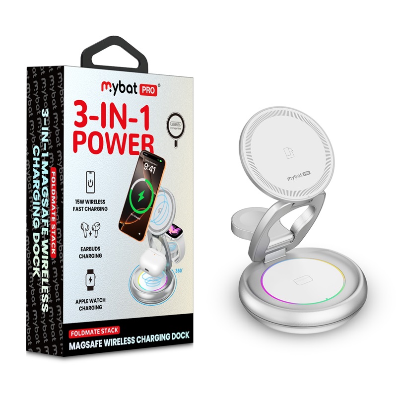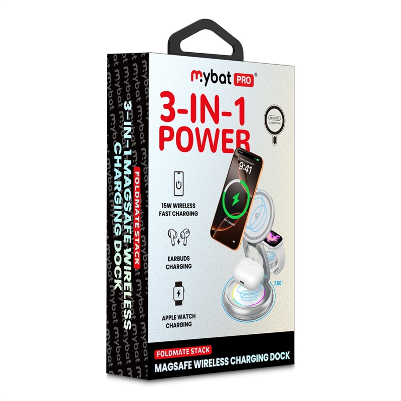 All your power, stacked. The MyBat Pro 3-in-1 FoldMate Stack Wireless Charging Dock brings fast, organized charging to your desk, nightstand, or wherever you power up. Designed as a compact, all-in-one dock, it neatly charges your phone, smartwatch, and wireless earbuds together in one sleek vertical setup. The MagSafe-compatible pad offers a perfect snap-on connection for your iPhone, while the built-in Apple Watch charging puck and Qi-enabled earbud pad deliver effortless power without cable clutter. When you are done, the dock folds completely flat for travel or easy storage. With up to 15W of fast wireless output, a soft-glow LED indicator, and intelligent safety control, the FoldMate Stack keeps every device powered, protected, and perfectly docked.