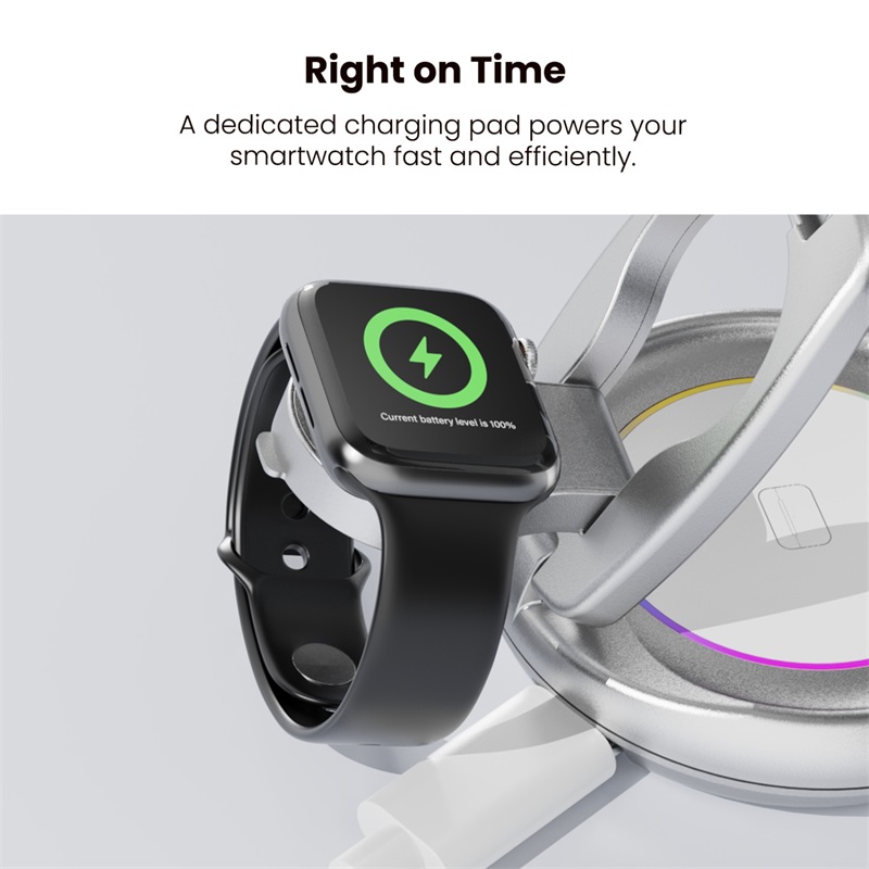 • 3-in-1 Wireless Charging Dock – Powers your smartphone, smartwatch, and wireless earbuds together in one organized station.