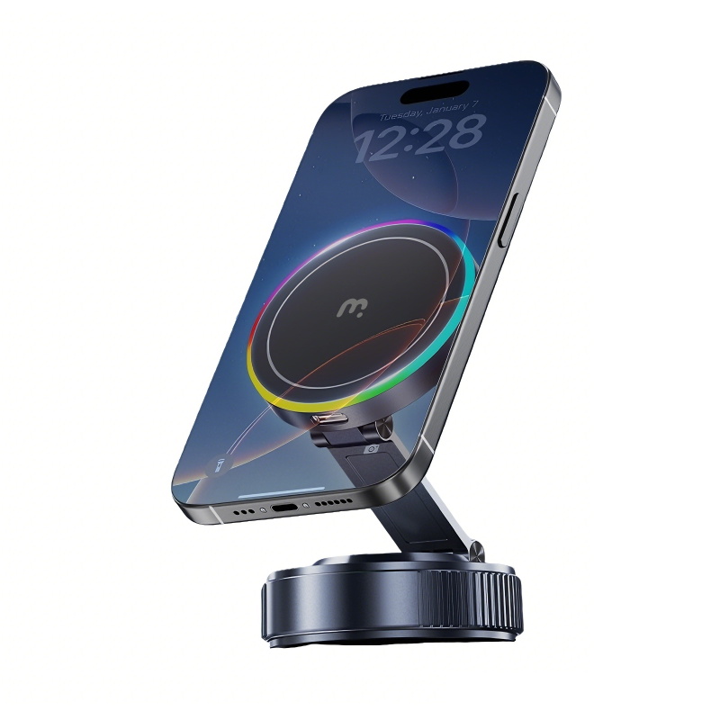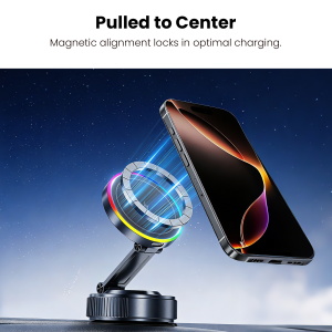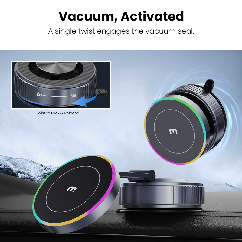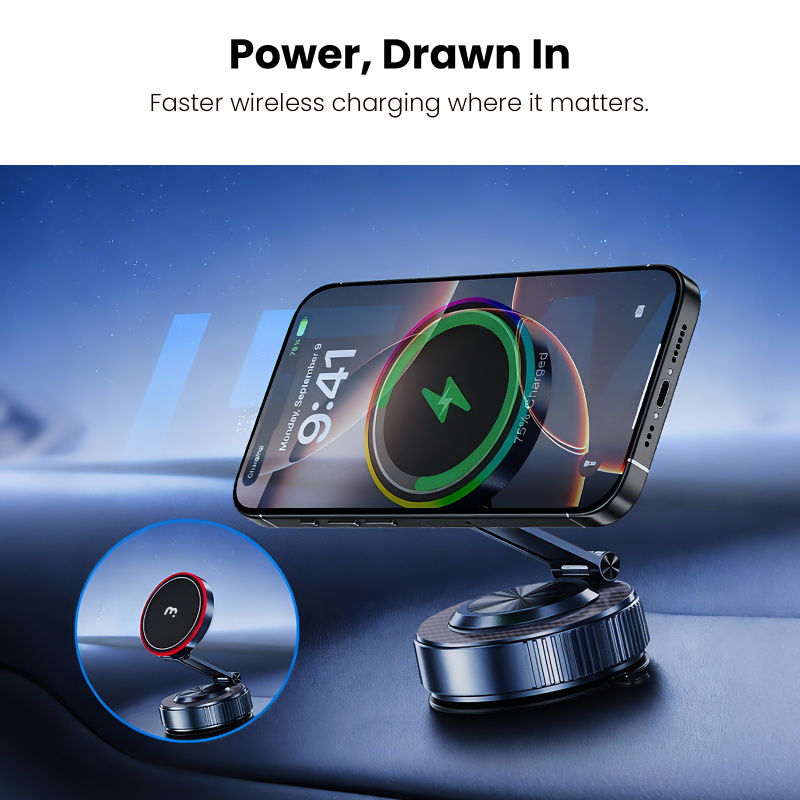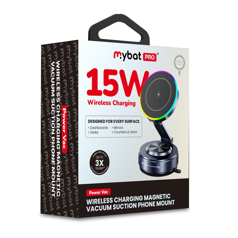 Power out of thin air. The MyBat Pro PowerVac is a wireless charging vacuum suction phone mount designed for a stronger hold and faster charging on any smooth flat surface. The vacuum seal creates a secure grip that works on dashboards, windshields, mirrors, desks, and countertops, giving you a stable hands free phone holder for driving or home use. The built in 15W fast wireless charger powers your device up to three times faster than standard wireless car chargers, while the magnetic MagSafe alignment snaps your phone into the ideal position for charging and navigation. A soft LED halo confirms active power, and the 360 degree adjustable arm keeps your screen easy to view for GPS, calls, and streaming. Press it down, twist to seal, and let this vacuum suction phone mount lock your device firmly in place wherever you need it.