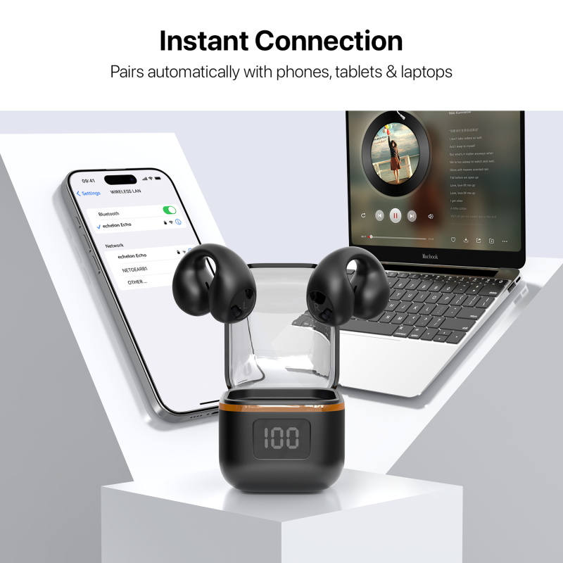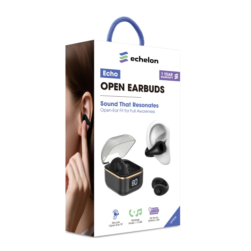 Sound That Resonates Enjoy high-definition wireless sound with an open-ear fit that keeps you connected to your surroundings. echelon Echo Open Earbuds deliver clear, immersive audio and environmental awareness, making them the perfect wireless open-ear earbuds for workouts, commutes, and daily life. Quick-Pair Technology connects instantly to any smartphone, tablet, or laptop for seamless streaming and hands-free calls. Smart touch controls and voice assistant compatibility make managing music and calls effortless on the move. Lightweight, secure, and designed for all-day comfort, Echo stays put through every run and routine. With an IPX5 waterproof rating and up to 24 hours of total playtime with the compact charging case, these wireless open-ear earbuds keep the music going no matter the weather.