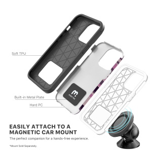 You can be sure that your customers will be able to get more use out of their iPhone 13 Pro since it will be protected from every angle with the Fuse Series case. The dual-layer design, a pink camo rugged polycarbonate outer shell, and padded TPU inner shell set the bar for securing your customers' iPhone 13 Pro from scratches and bumps and drops with 2X more protection than standard cases. Raised bezel edges and texturized ridges provide added safety while allowing easy access to all buttons and ports. The built-in metal plate offers instant locking power, enabling the most secure and safe mounting experience.