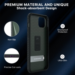 EMBEDDED ULTRA SLIM KICKSTAND-This iPhone case with stand can be adjusted to 75° (maximum to 65mm wide) to stand horizontally stablely to meet a variety of life and work scenarios. It offers the most optimal viewing points to watch films and alleviates your neck, wrist pain, definitely the go-to for long-sit office workers.
