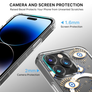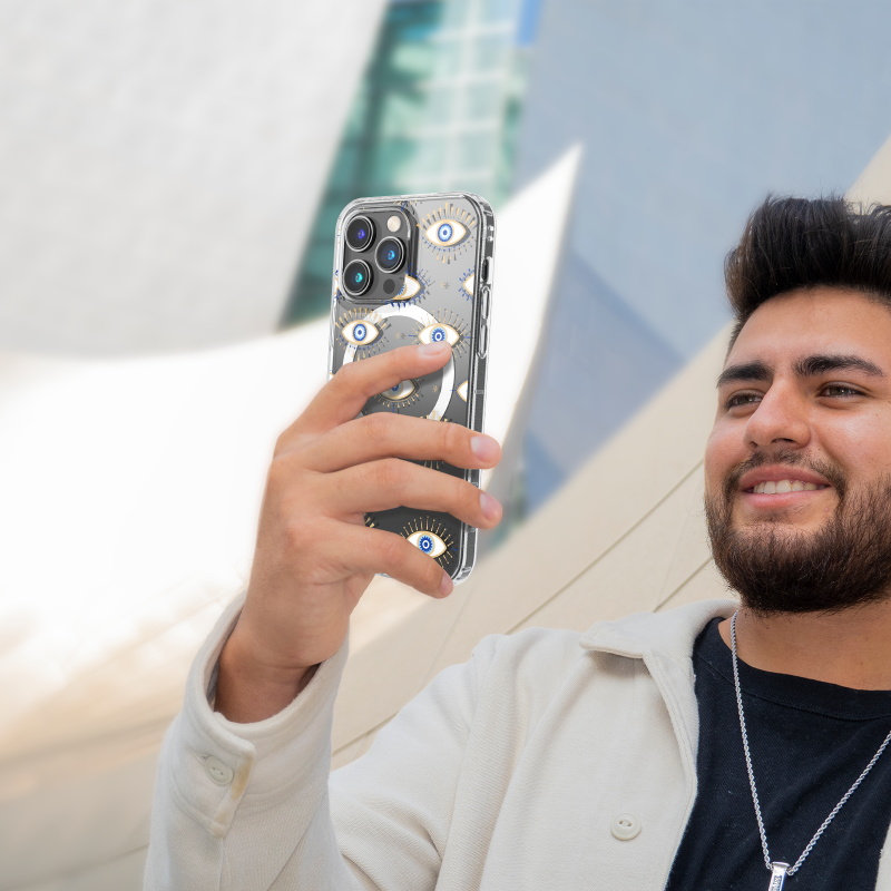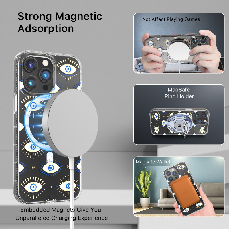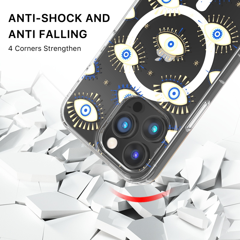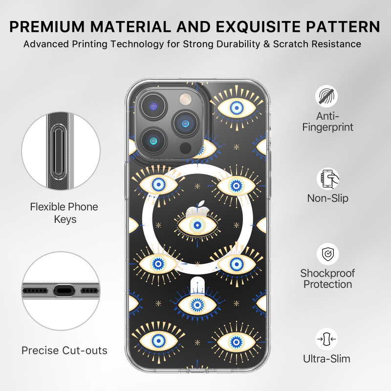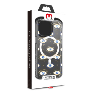 The Mood Series MagSafe iPhone 14 Pro (6.1) Case shows off your customer's unique personality while keeping watch over their iPhone with the Evil Eyes design matching their outfits, backpacks, bags, and awesome sense of style! By using the included +AttachMe magnetic ring, the case is compatible with all MagSafe accessories, chargers, and mounts, and locks on securely with an incredibly powerful magnetic hold. The elegant and fashionable Mood Series MagSafe iPhone 14 Pro (6.1) Case features raised bezel edges and anti-shock corners for maximum protection from falls, scratches, and cracks while being compact for easy access to all ports and buttons. Crafted from premium materials, smudges, grease, and dirt will never out style your customer’s Mood Series MagSafe  iPhone 14 Pro (6.1) Case.