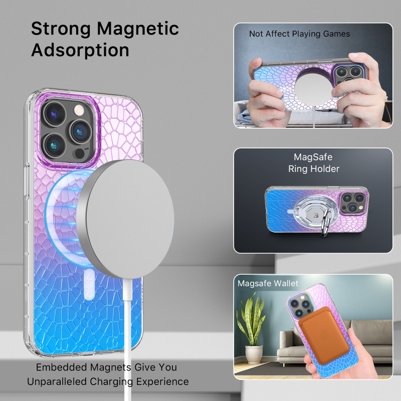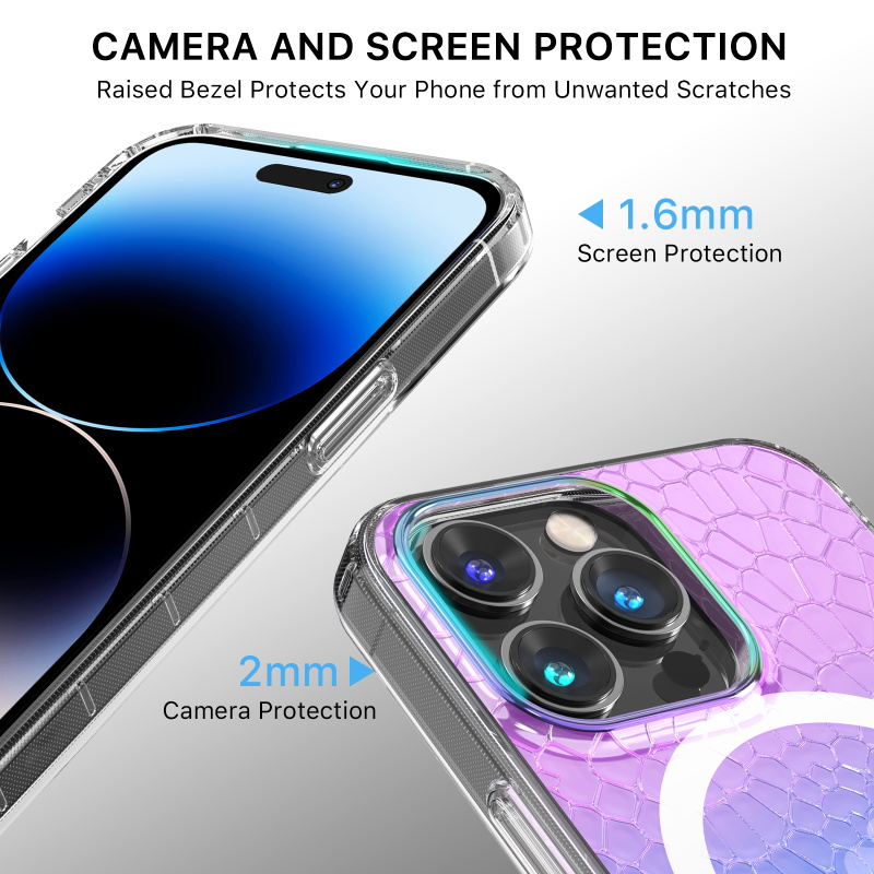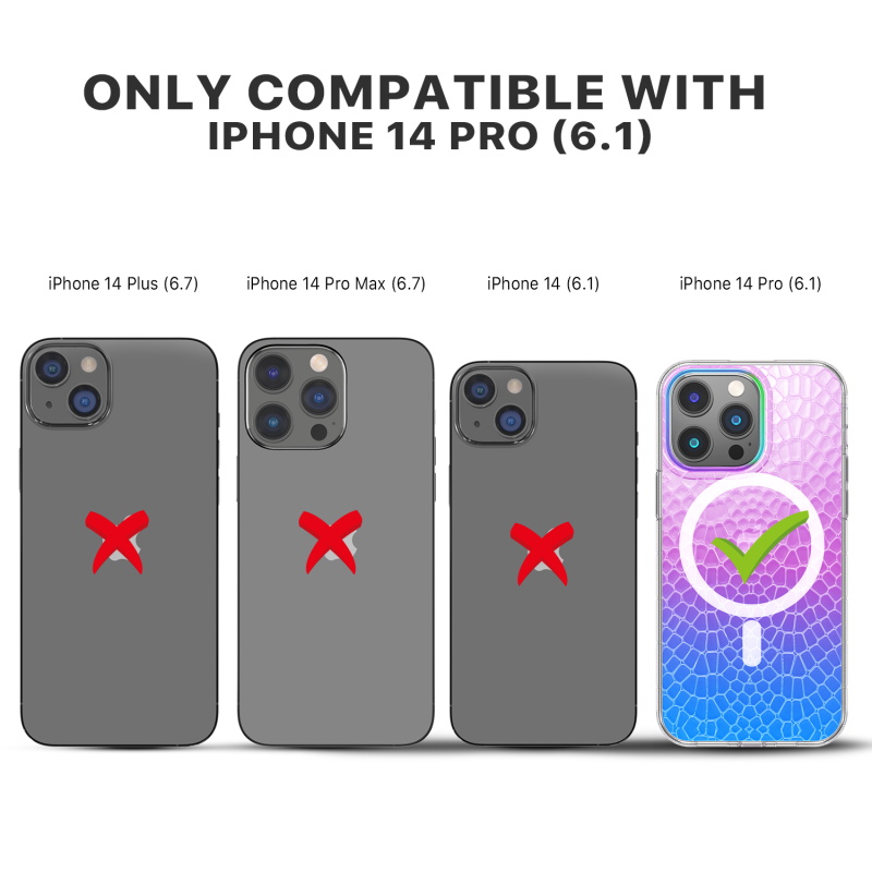 The Mood Series MagSafe iPhone 14 Pro (6.1) Case shows off your customer's unique personality with the Holographic Iridescent Snake design while matching their outfits, backpacks, bags, and awesome sense of style! By using the included +AttachMe magnetic ring, the case is compatible with all MagSafe accessories, chargers, and mounts, and locks on securely with an incredibly powerful magnetic hold. The elegant and fashionable Mood Series MagSafe iPhone 14 Pro (6.1) Case features raised bezel edges and anti-shock corners for maximum protection from falls, scratches, and cracks while being compact for easy access to all ports and buttons. Crafted from premium materials, smudges, grease, and dirt will never out style your customer’s Mood Series MagSafe  iPhone 14 Pro (6.1) Case.