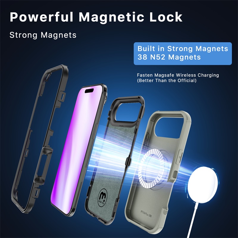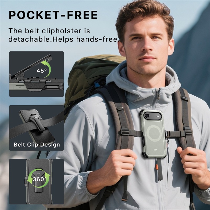 Textured edges and a slip-resistant bumper grip offer a comfortable and secure hold, facilitating easy access to all essential functions and enhancing their efficiency. The modern MagSafe-compatible magnetic ring facilitates effortless attachment to metallic surfaces, accessories, and mounts, streamlining their productivity. The inclusion of a 360° rotating holster clip and kickstand provides unparalleled convenience, catering to their on-the-go demands.