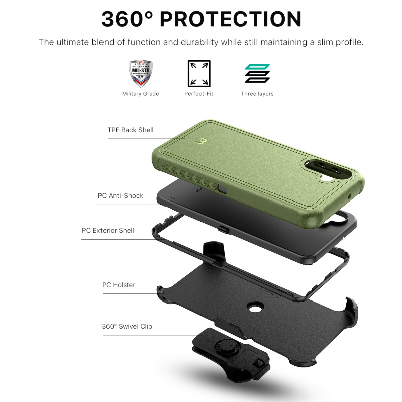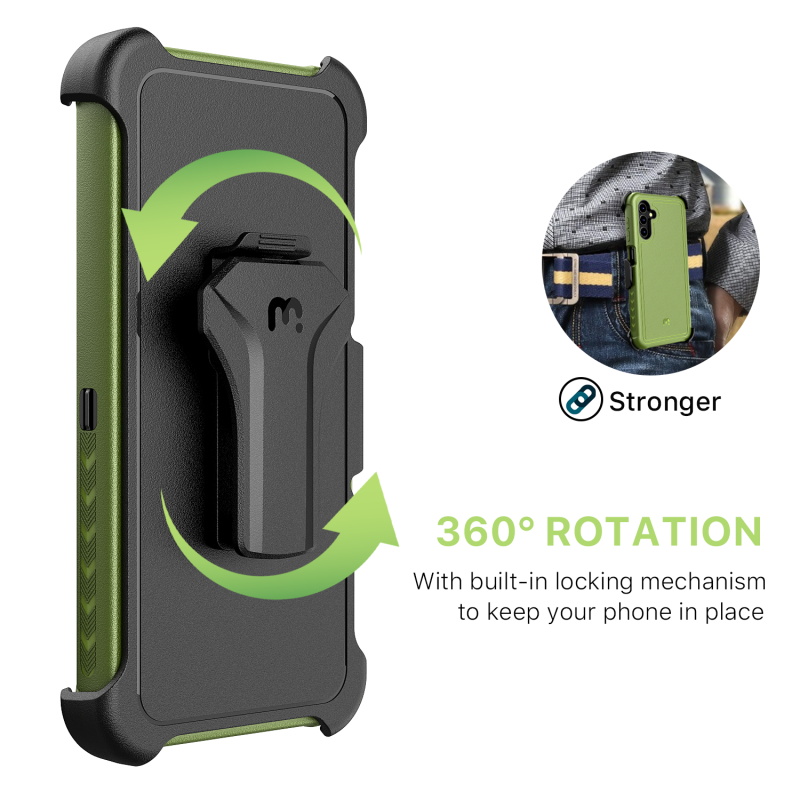 The Maverick Series Galaxy A13 5G Case provides the perfect barrier shielding for your customer’s Galaxy A13 5G with military-grade protection. The triple-layer construction of the case, including a rugged black TPE backing shell, an anti-shock polycarbonate inner shell, and a polycarbonate exterior shell, provides the ultimate protection against drops, scratches, and cracks. They will experience the perfect in-hand feel with textured edges and a non-slip bumper grip for easy access to all buttons and ports. They can also attach the Maverick Series Galaxy A13 5G Case and go anywhere using the 360° rotating holster clip or set it down and use it as a kickstand for convenient hands-free viewing. Designed from anti-microbial materials, the Maverick Series Galaxy A13 5G Case can ward off any threat, even microscopic.