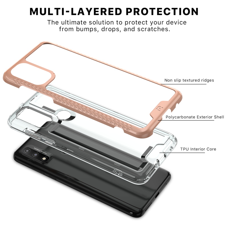 Designed for those drawn to beauty over complexity, the modern and sleek Lux cases will display the regal color of your customer’s Moto G Pure with fully transparent backing. Protect your customer's Moto G Pure from scratches, bumps, and drops with this stylish dual-layer design, a rose gold polycarbonate outer shell, and a padded TPU inner shell with 2X the durability of standard cases. The Lux clear case feature raised bezel edges and texturized ridged edges for additional safety while providing your customers easy access to all buttons and ports. The ultra-slim and lightweight design make it compatible with all wireless chargers, so they don’t have to remove the case when they need to power up! The included high-grade tempered glass screen protector provides diamond-level protection, boasting an incredible 9H hardness and raised bezel edges to keep your customer's screen safe and pristine!