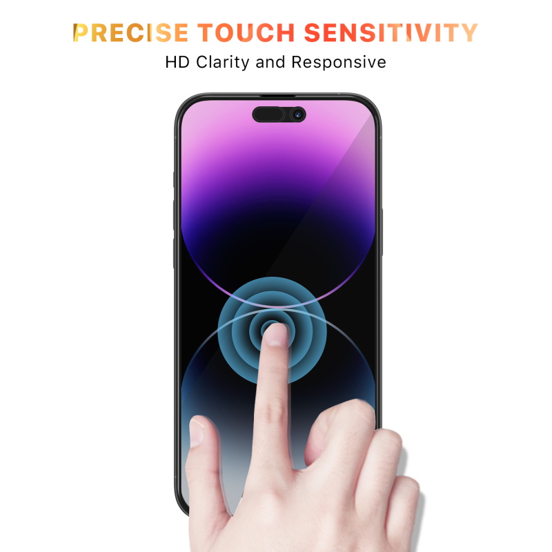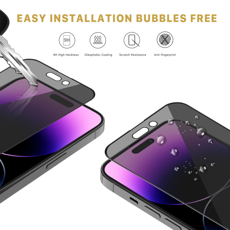 MyBat Pro’s iPhone 14 Pro Max Full Coverage Privacy Tempered Glass Screen Protector offers your customer’s phone a comprehensive curved multi-layered defense 5X stronger than standard glass while delivering diamond level 9H hardness. The privacy coating ensures that only your customers can see their screens and that onlookers will get a filtered view of the screen, protecting valuable information and data. Installing it is easy and leaves no air bubbles or distortions, only high-definition clarity. Despite being only 0.33mm thick and extremely lightweight, customers' iPhone 14 Pro Max screens will have maximum scratch, drop, impact, and shatter protection. EZ Fingerprint Unlock makes it easy for your customers to access their phone at any time while the premium oleophobic coating ensures they'll never have to worry about smudges, fingerprints, or dirt littering their screen. The iPhone 14 Pro Max Full Coverage Privacy Tempered Glass Screen Protector offers a perfect fit without limiting any touch sensitivity, even with a case on.