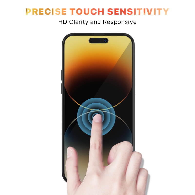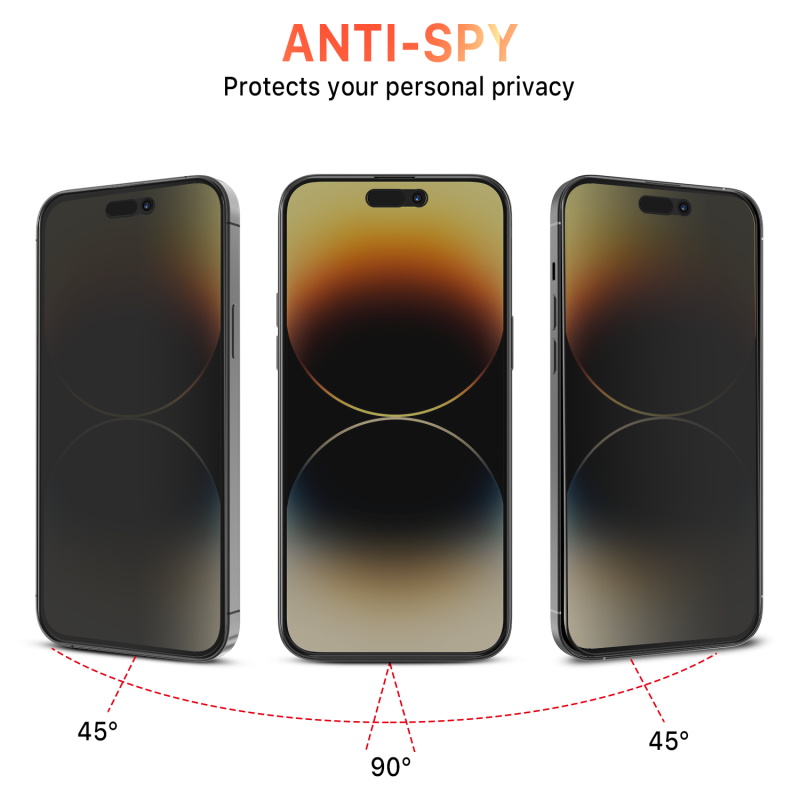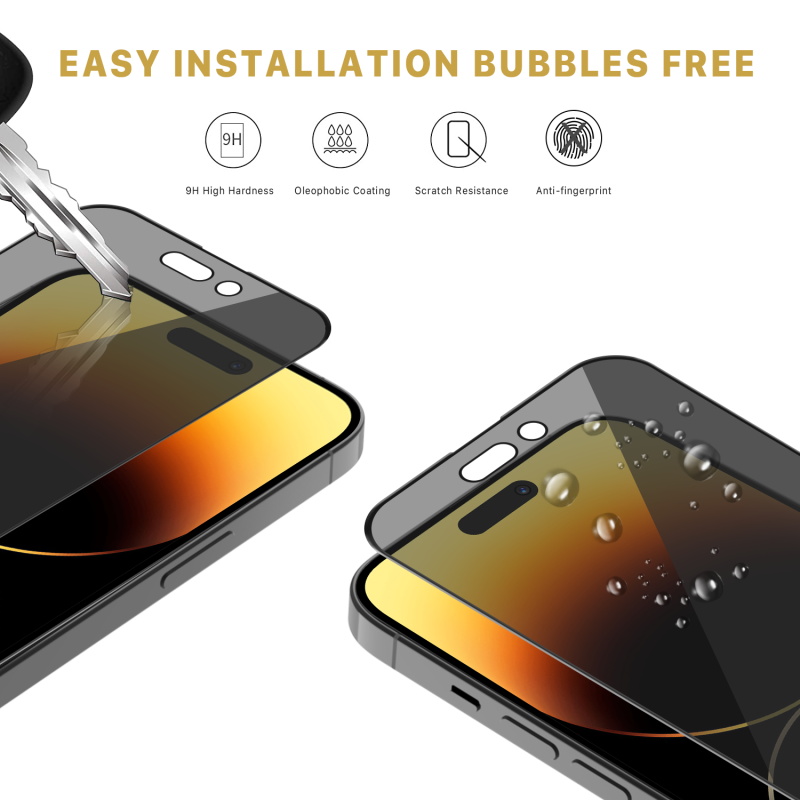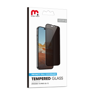MyBat Pro’s iPhone 14 Pro (6.1) Full Coverage Privacy Tempered Glass Screen Protector offers your customer’s phone a comprehensive curved multi-layered defense 5X stronger than standard glass while delivering diamond level 9H hardness. The privacy coating ensures that only your customers can see their screens and that onlookers will get a filtered view of the screen, protecting valuable information and data. Installing it is easy and leaves no air bubbles or distortions, only high-definition clarity. Despite being only 0.33mm thick and extremely lightweight, customers' iPhone 14 Pro (6.1) screens will have maximum scratch, drop, impact, and shatter protection. EZ Fingerprint Unlock makes it easy for your customers to access their phone at any time while the premium oleophobic coating ensures they'll never have to worry about smudges, fingerprints, or dirt littering their screen. The iPhone 14 Pro (6.1) Full Coverage Privacy Tempered Glass Screen Protector offers a perfect fit without limiting any touch sensitivity, even with a case on.
