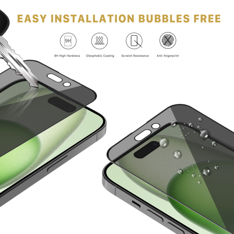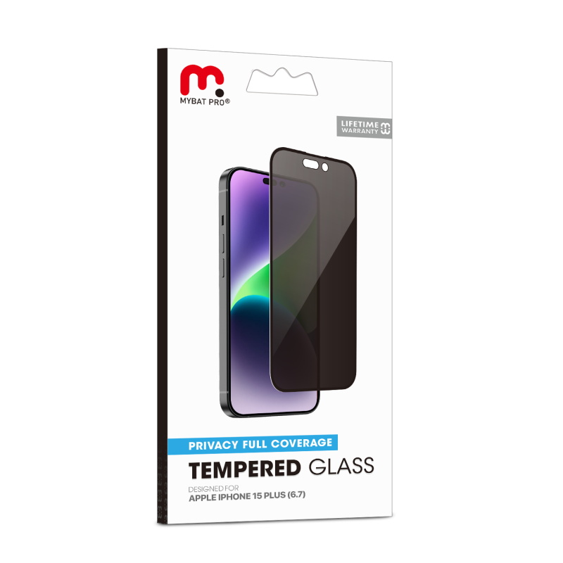 MyBat Pro’s iPhone 15 Plus (6.7) Full Coverage Privacy Tempered Glass Screen Protector offers your customer’s phone a comprehensive curved multi-layered defense 5X stronger than standard glass while delivering diamond level 9H hardness. The privacy coating ensures that only your customers can see their screens and that onlookers will get a filtered view of the screen, protecting valuable information and data. Installing it is easy and leaves no air bubbles or distortions, only high-definition clarity. Despite being only 0.33mm thick and extremely lightweight, customers' iPhone 15 Plus (6.7) screens will have maximum scratch, drop, impact, and shatter protection. EZ Fingerprint Unlock makes it easy for your customers to access their phone at any time while the premium oleophobic coating ensures they'll never have to worry about smudges, fingerprints, or dirt littering their screen. The iPhone 15 Plus (6.7) Full Coverage Privacy Tempered Glass Screen Protector offers a perfect fit without limiting any touch sensitivity, even with a case on.