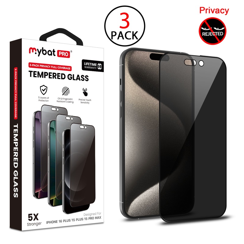 HOME:   Apple -> iPhone 15 Pro Max -> Tempered Glass->MyBat Pro Privacy Full Coverage Tempered Glass Screen Protector (3-pack) for Apple iPhone 15 Pro Max/iPhone 16 Plus / 15 Plus - Black