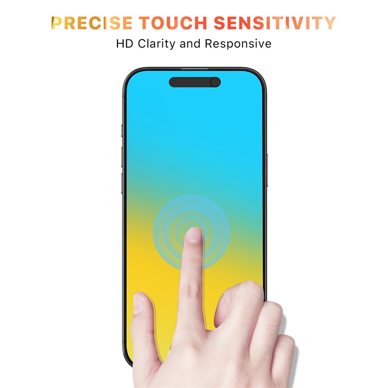 MyBat Pro’s iPhone 16 Pro Full Coverage Privacy Tempered Glass Screen Protector offers your customer’s phone a comprehensive curved multi-layered defense 5X stronger than standard glass while delivering diamond level 9H hardness. The privacy coating ensures that only your customers can see their screens and that onlookers will get a filtered view of the screen, protecting valuable information and data. Installing it is easy and leaves no air bubbles or distortions, only high-definition clarity. Despite being only 0.33mm thick and extremely lightweight, customers' iPhone 16 Pro screens will have maximum scratch, drop, impact, and shatter protection. EZ Fingerprint Unlock makes it easy for your customers to access their phone at any time while the premium oleophobic coating ensures they'll never have to worry about smudges, fingerprints, or dirt littering their screen. The iPhone 16 Pro Full Coverage Privacy Tempered Glass Screen Protector offers a perfect fit without limiting any touch sensitivity, even with a case on.