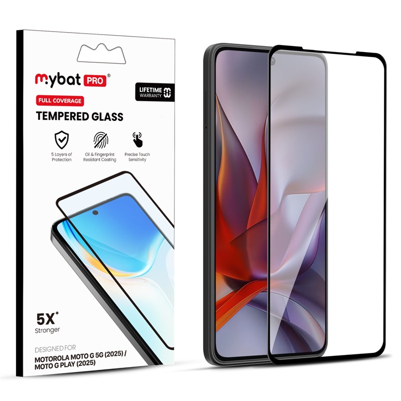 MyBat Pro’s Moto G 5G (2025) / Moto G Play (2025) Full Coverage Tempered Glass Screen Protector offers your customer’s phone a comprehensive multi-layer defense 5X stronger than standard glass while delivering diamond level 9H hardness. Installing it is easy and leaves no air bubbles or distortions, only high-definition clarity. Despite being only 0.33mm thick and extremely lightweight, customers' Moto G 5G (2025) / Moto G Play (2025) screens will have maximum scratch, drop, impact, and shatter protection. The oleophobic coating will ensure that they will never have to worry about smudges, fingerprints, or dirt littering their screen again. The Moto G 5G (2025) / Moto G Play (2025) Full Coverage Tempered Glass Screen Protector offers a perfect fit without limiting any touch sensitivity, even with a case on.