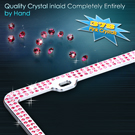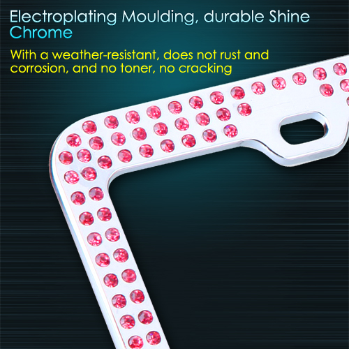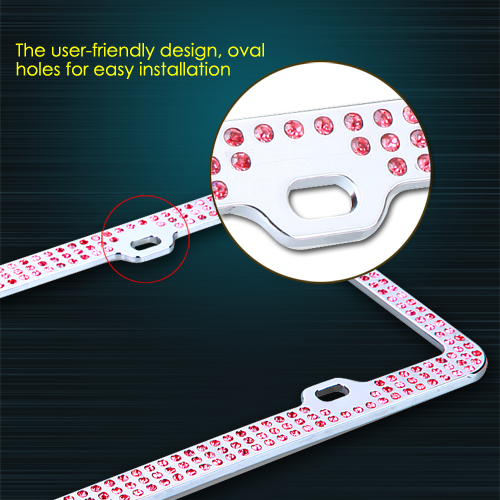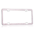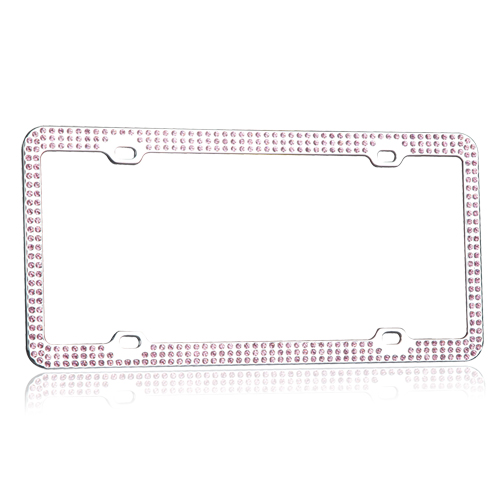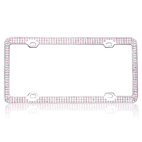This elegantly crafted, 3-row pink rhinestone crystal-lined chrome license plate frame adds a touch of luxury and sleek shine to any vehicle. The frame measures 12.25 x 6.25 inches, the ideal size, and fits any car. The frame meets all state laws and won't block any registration tags. This durable stainless steel license plate holder provides maximum protection from weather conditions and will not easily bend or deform. License plate screws, and screw covers, are included in the package.