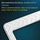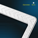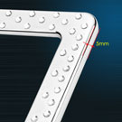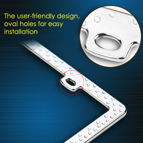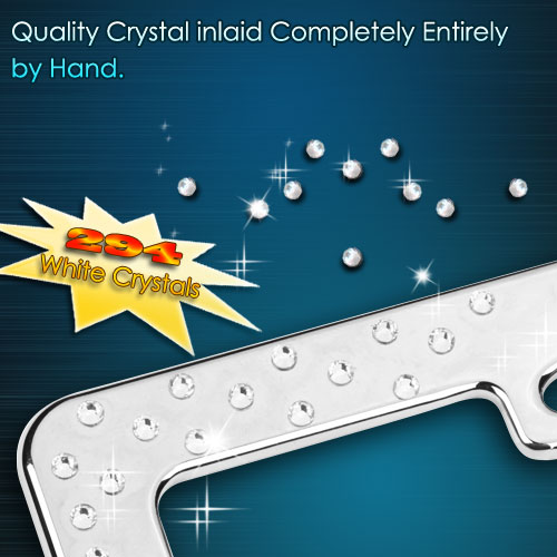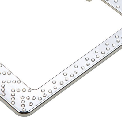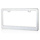 Intricately designed with bright white crystal inlays arranged in arrows, this chrome license plate frame makes a great way to give customers' vehicles that extra touch of style. The frame measures 12.25 x 6.25 inches, the ideal size, and fits any vehicle. The frame meets all state laws and won't block any registration tags. This durable stainless steel license plate holder provides maximum protection from weather conditions and will not easily bend or deform. License plate screws, and screw covers, are included in the package.