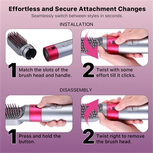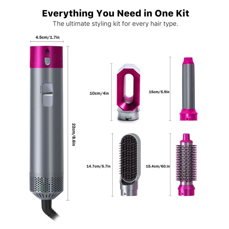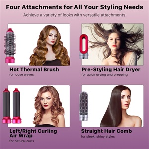 The Roykin 5-in-1 Blow Dryer Hair Brush and Styling Kit offers a professional-grade styling experience with five interchangeable brush attachments, allowing you to create curls, straight styles, and volume effortlessly. Its anti-scald design ensures safe and comfortable styling, while the air volume header delivers powerful airflow for faster results. Featuring a safe lock system for interchangeable heads, switching between styling modes is quick and secure. The 360° rotating power cord adds convenience by preventing tangles, and the air inlet hole design enhances ventilation for efficient heat distribution. With 3 adjustable temperature settings (low, medium, high), this kit is suitable for all hair types and styling preferences, making it perfect for both personal use and professional salons.