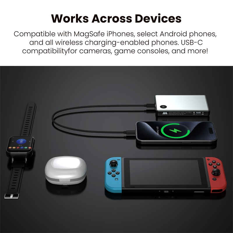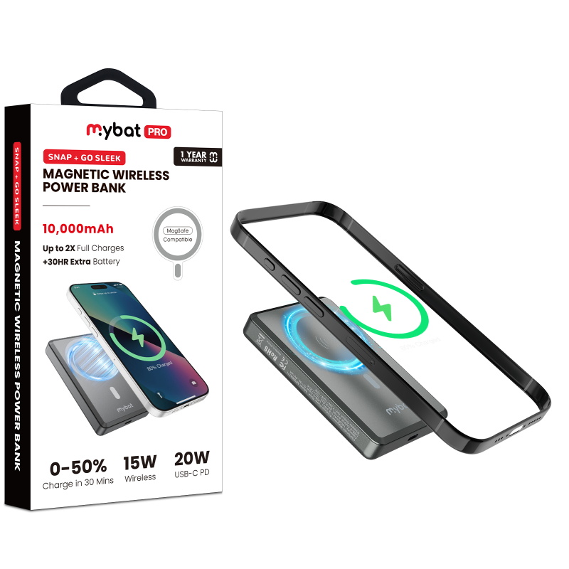 The MyBat Pro SNAP + GO SLEEK Magnetic Wireless Power Bank snaps securely onto the back of the iPhone 14, 15, 16, or MagSafe case, and precise magnetic alignment makes sure the power bank never slips off while in use.  Featuring 15W of fast charging, your customers will get 3X the power of standard chargers and can connect to two devices to fast charge simultaneously thanks to the 20W USB-C Power Delivery port. The ultra-slim and lightweight design ensure the perfect fit for your customer, preventing extra bulk on their phones or blocking their cameras.