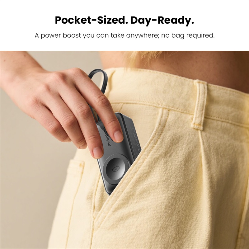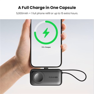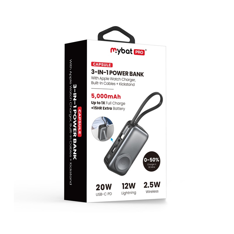 Power packed into a daily dose. The MyBat Pro Capsule 5,000mAh 3-in-1 Power Bank with Apple Watch Charger, Built-In Cables, and Kickstand keeps your phone, earbuds, and even your Apple Watch charged anywhere. A flip-out USB-C plug connects directly to phones and tablets with 20W fast charging, while the built-in Lightning cable provides 12W charging for Apple-compatible devices and doubles as a lanyard for easy carrying when not in use. The 2.5W magnetic wireless pad powers your Apple Watch on the go, and the 5,000mAh capacity delivers a full phone recharge or up to 15 extra hours of battery life. A convenient flip-out kickstand lets you prop your phone upright while it charges. With Smart Chip technology optimizing power delivery while preventing overheating and overcharging, the Capsule is the all-in-one backup built for daily carry.