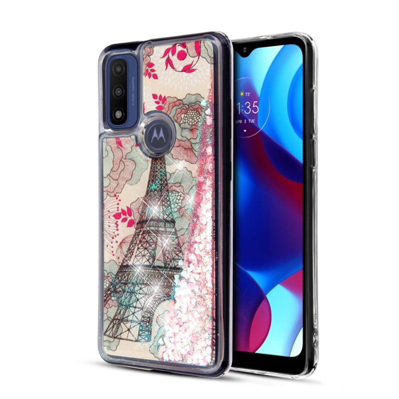 MyBat Quicksand Glitter Hybrid Protector Cover for Motorola Moto G Pure / Moto G Power (2022) - Eiffel Tower & Pink Hearts